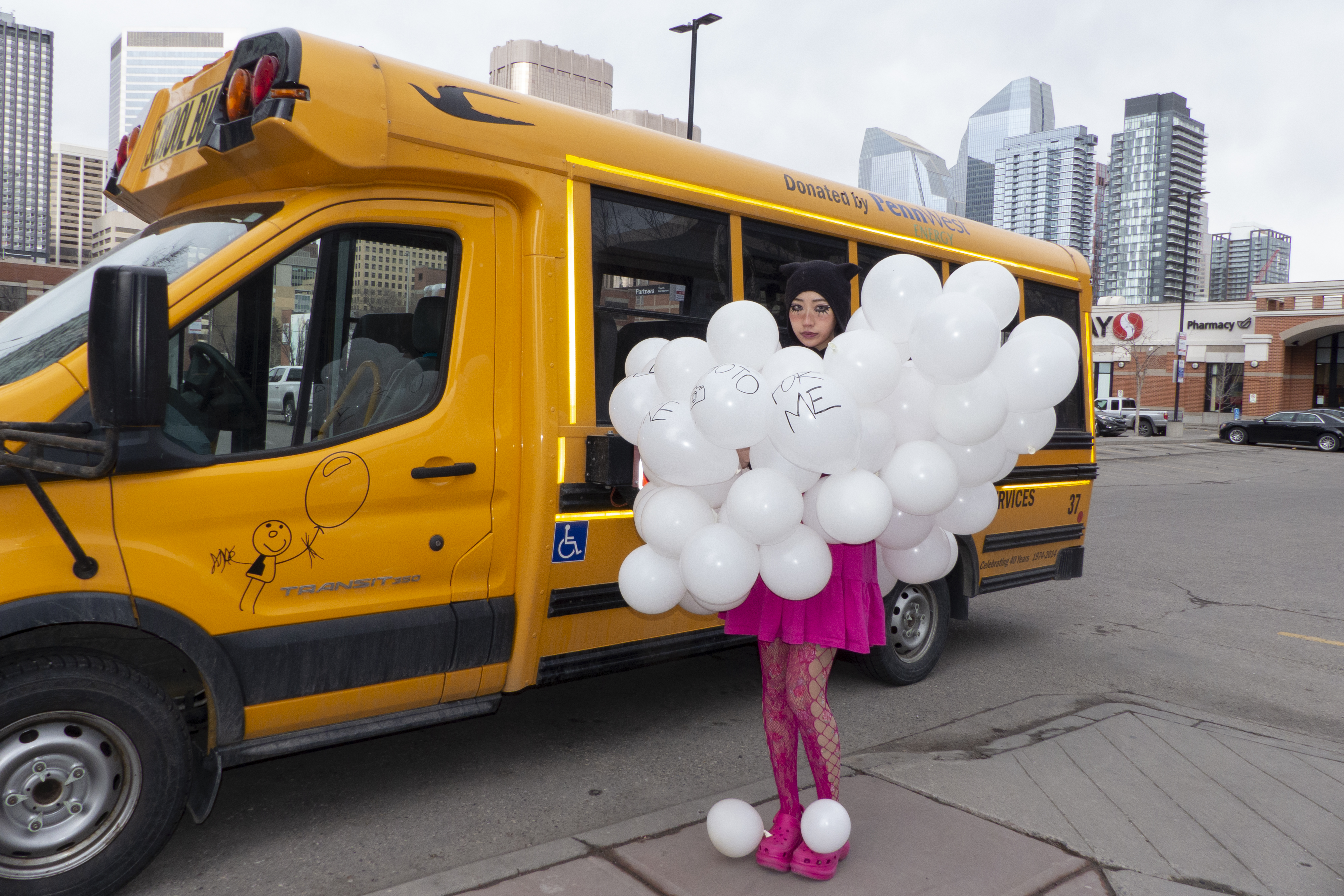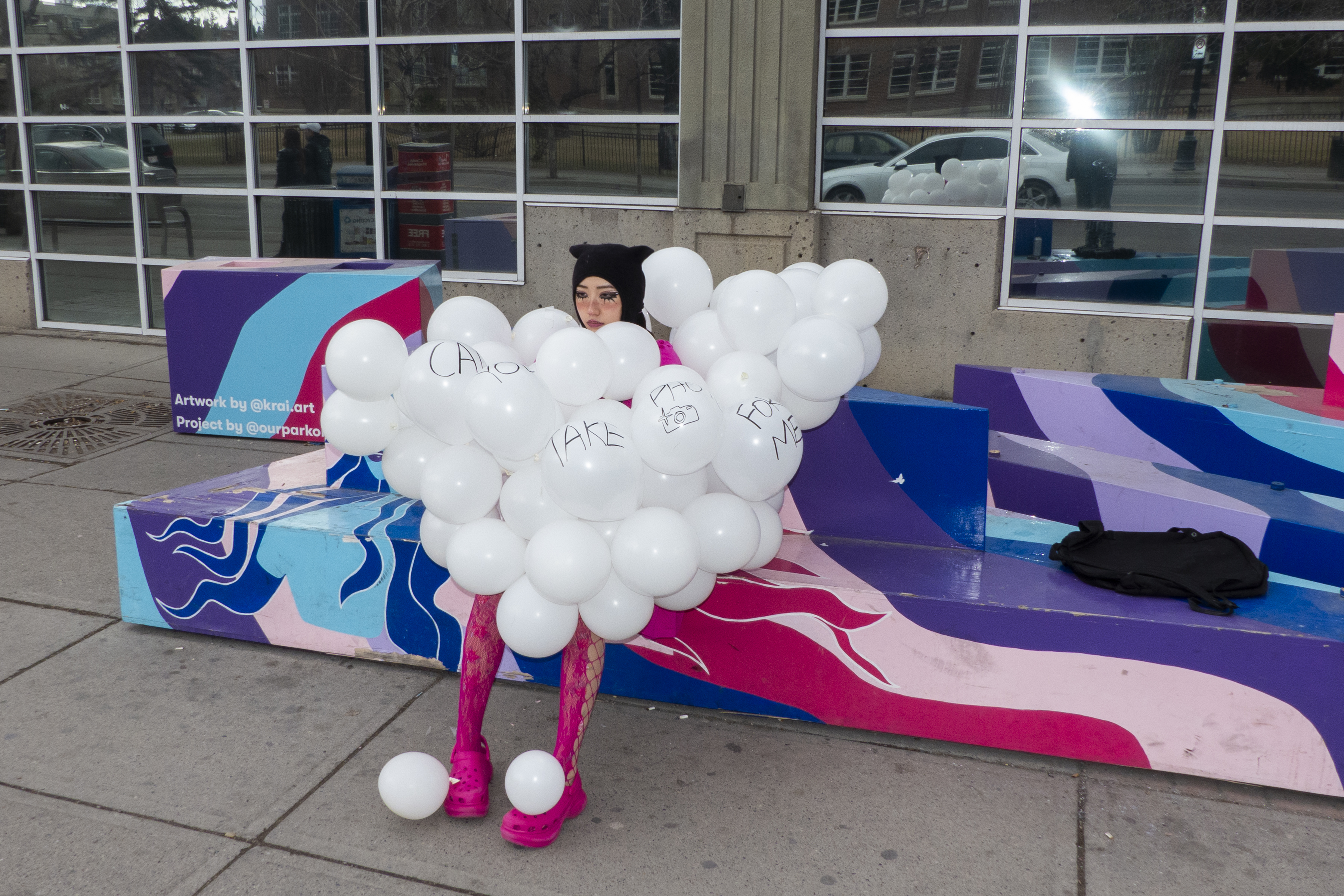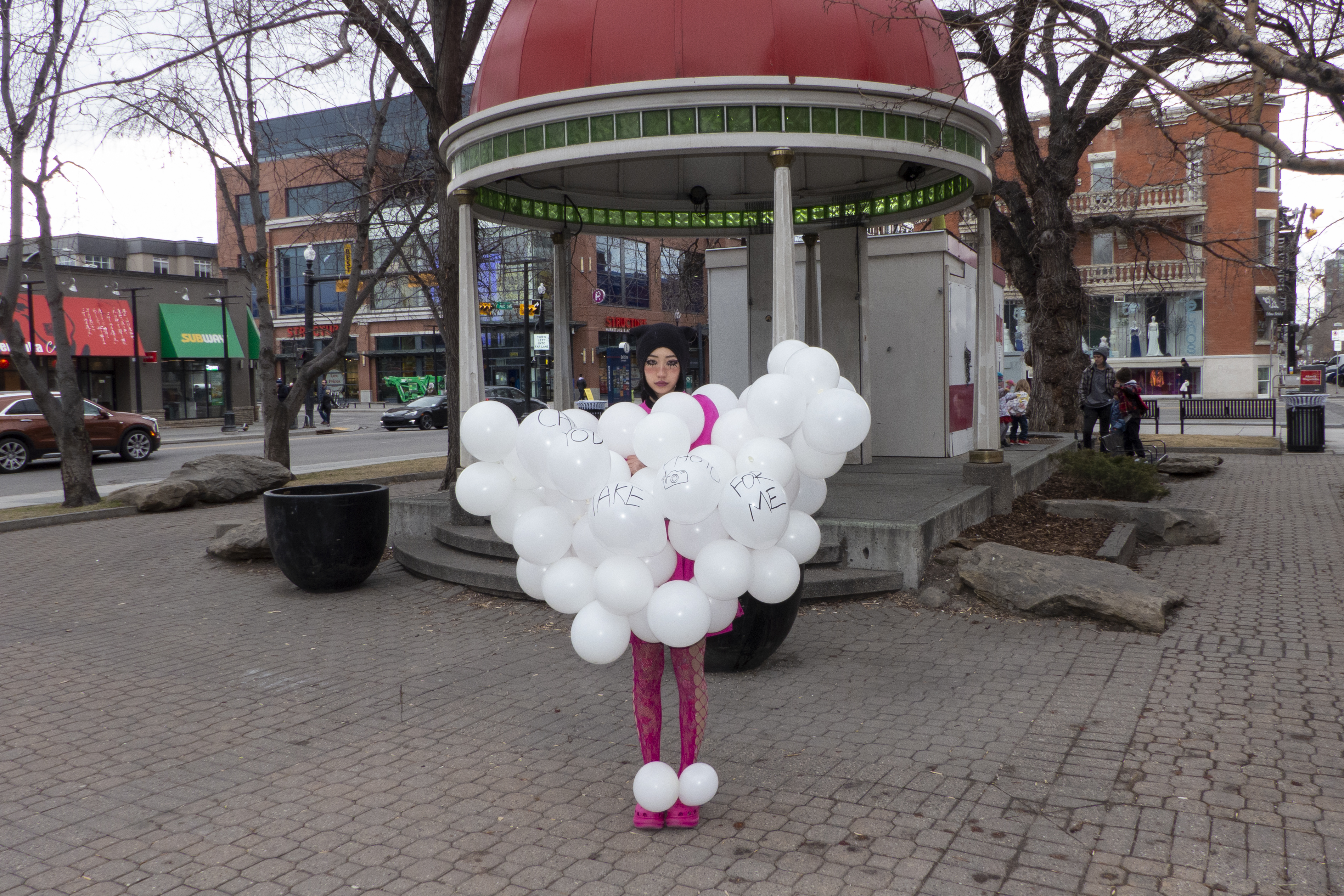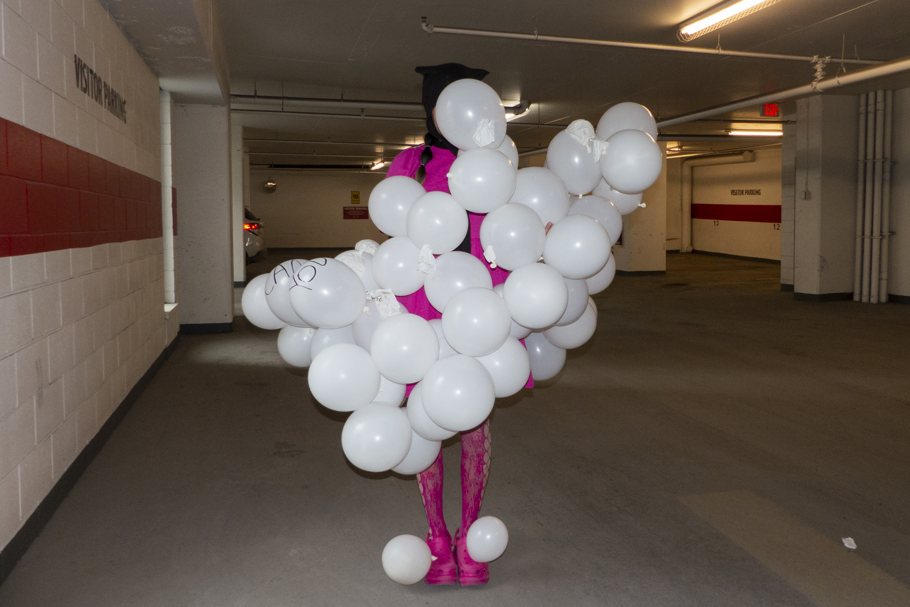 I made a heart-shaped dress out of balloons to support the role I am playing, representing a complete, pure, just-formed, and initial image of interacting with humans. The environment represents the environment in which we live, and all acts of reconciliation are based on this environment.